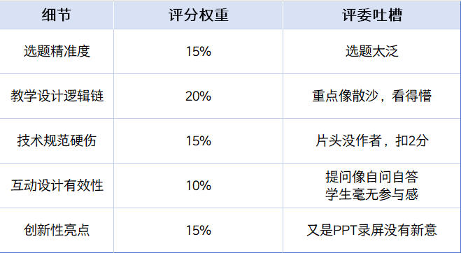 形式僵化:教师全程照读PPT、缺乏互动,会被评委诟病 “毫无微课特色”,难以获得高分。