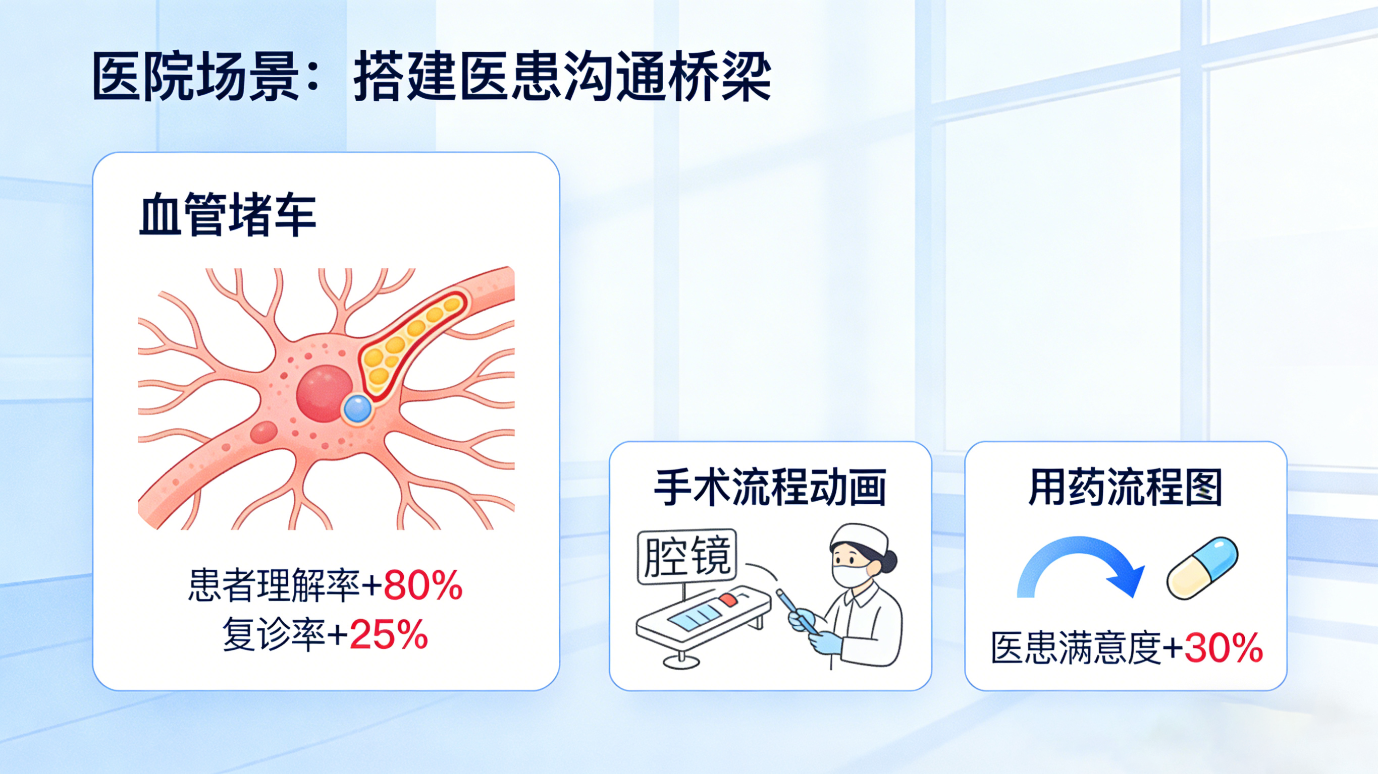 基层医院慢病管理科普因专业术语难懂,导致患者依从性低。栋科软件制作的心血管疾病科普MG动画,将 “血管堵塞” 具象为“公路堵车”,用药注意事项转化为动态流程图,患者理解率提升80%,复诊率提高25%。