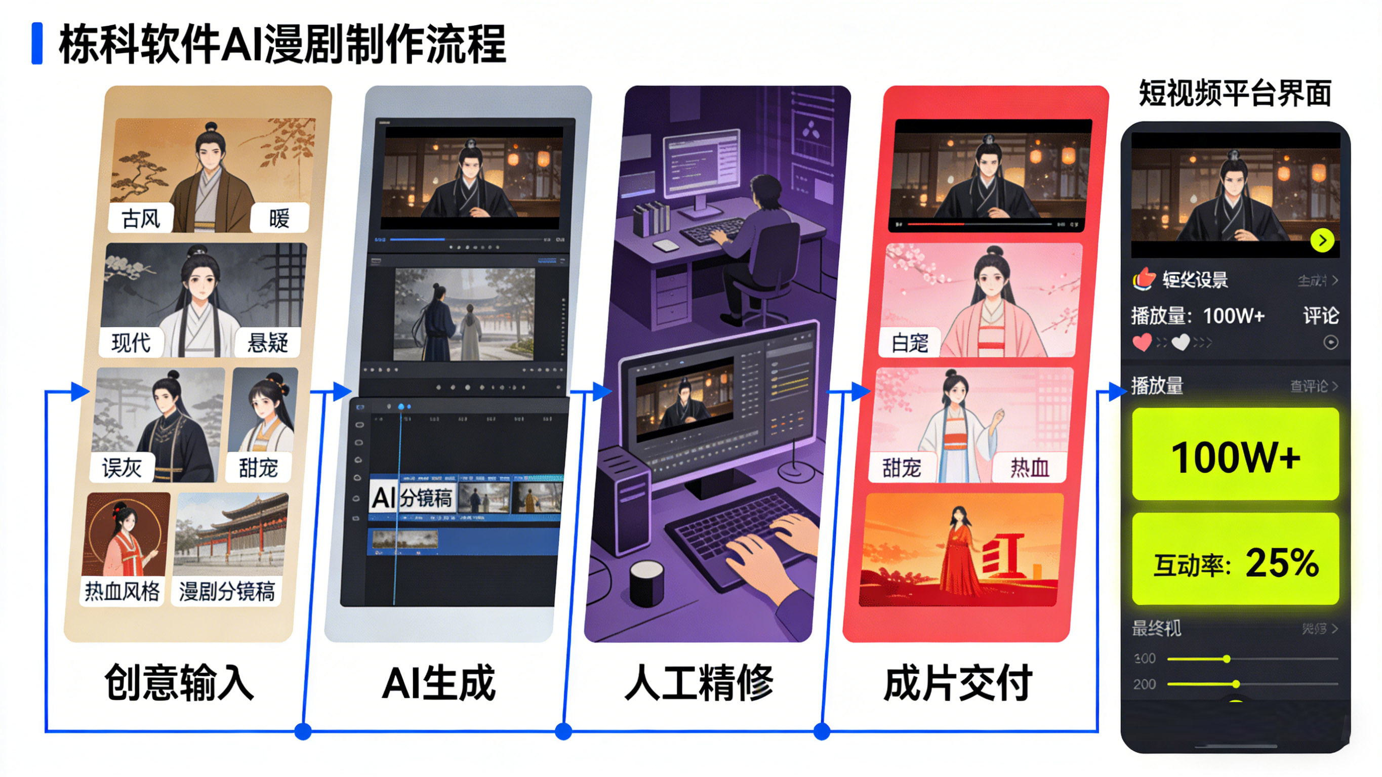 从剧本脚本、分镜设计、角色场景生成,到配音配乐、动态视频合成、后期剪辑,客户只需提供核心创意,即可收获可直接上线的高清漫剧成品。
